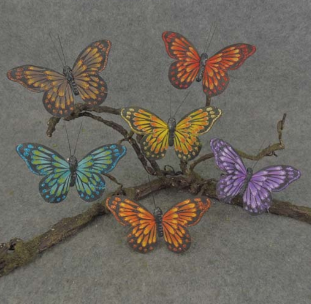 Our 4.5″ feather butterfly with glitter in earthtone colors comes with sturdy mounting clip. Two color assortments are available.