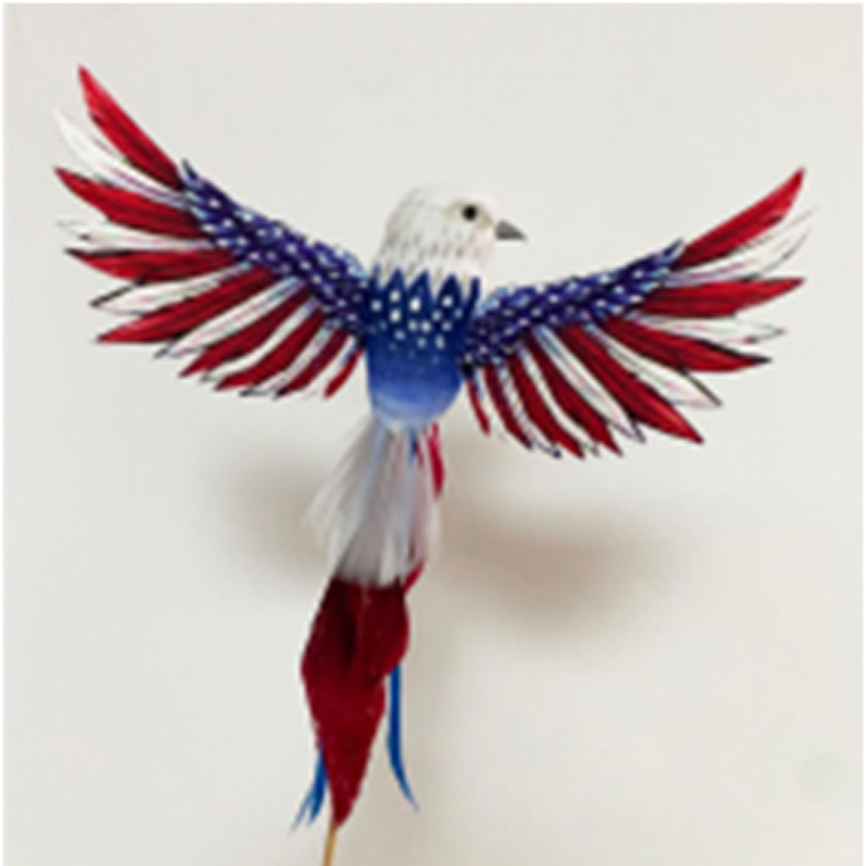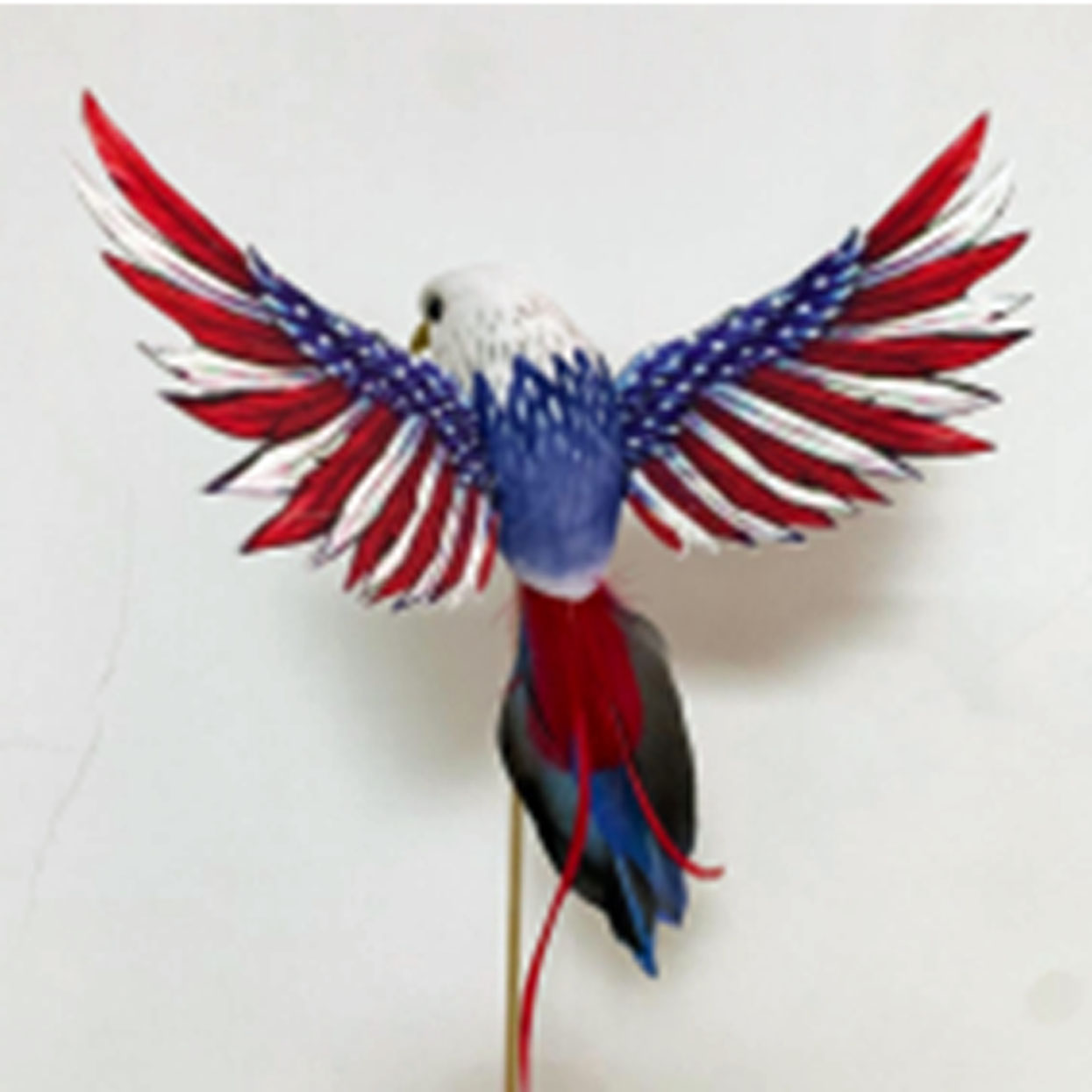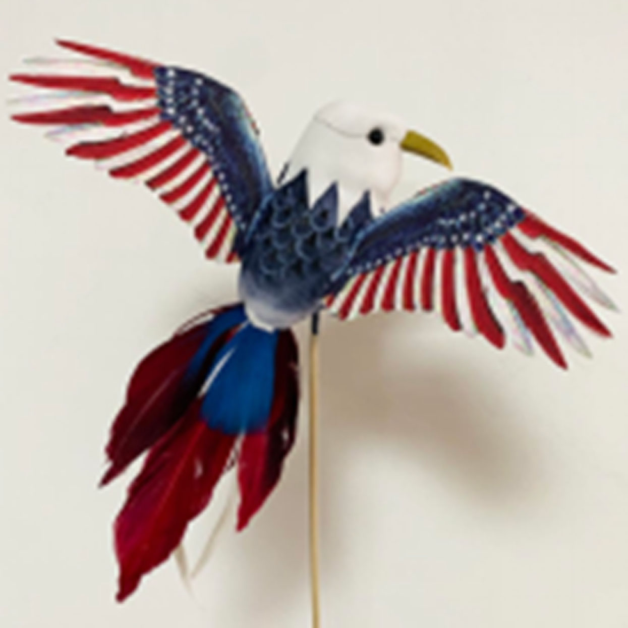 Our American Eagle series is available in three sizes. Mounted on a wooden pick, this beautifully-colored feather eagle shouts out the theme of “American Patriotism. This American eagle pick is sure to increase your summer flower sales as July 4th rolls around.